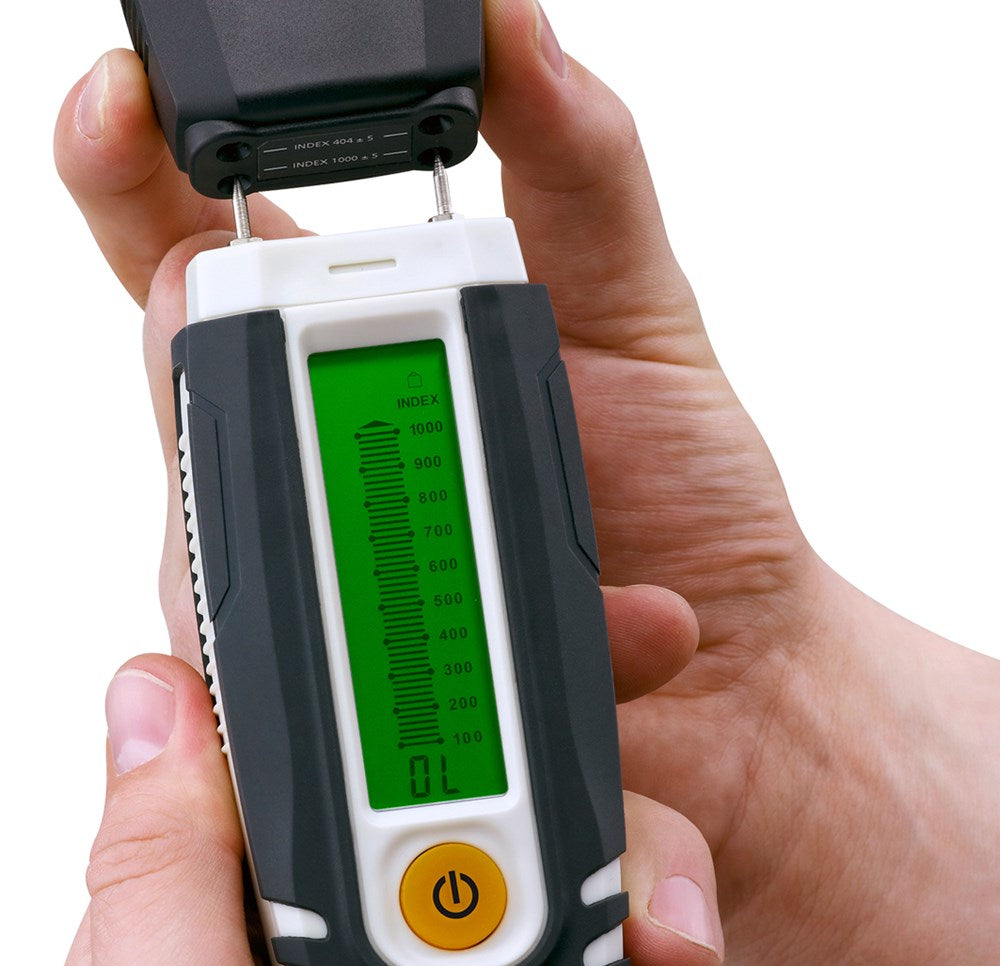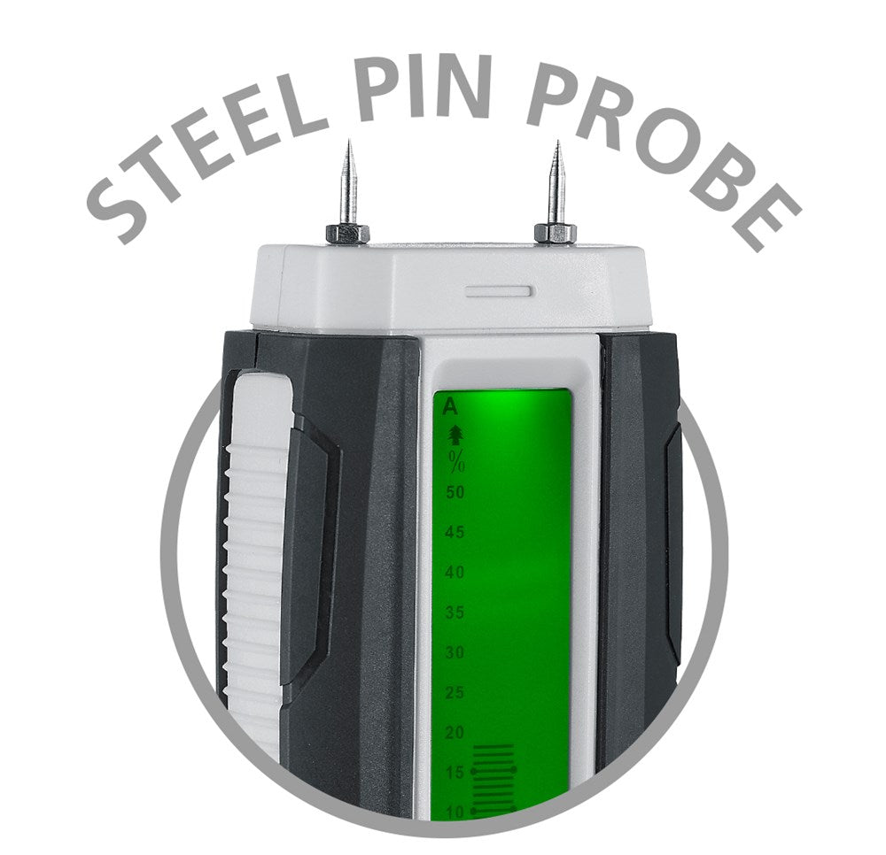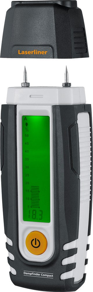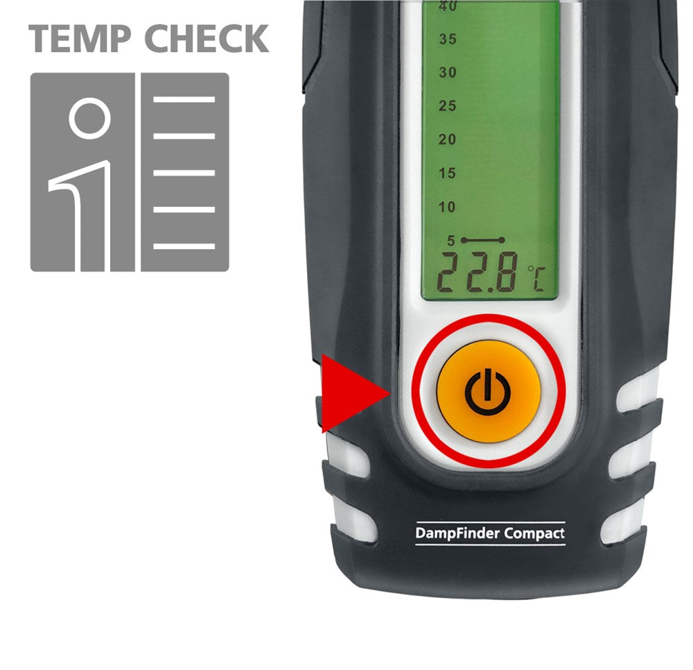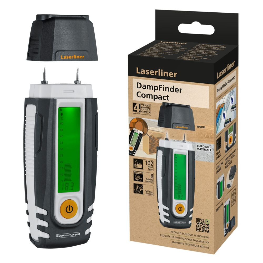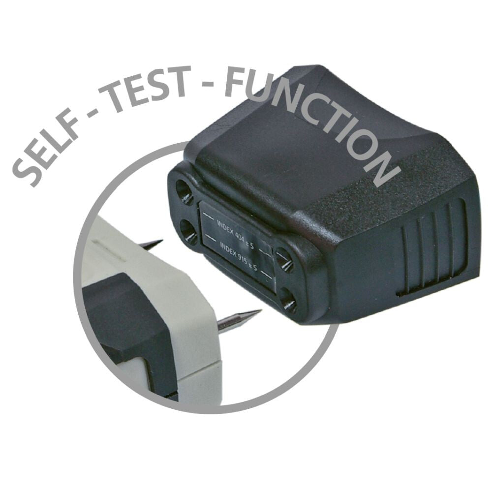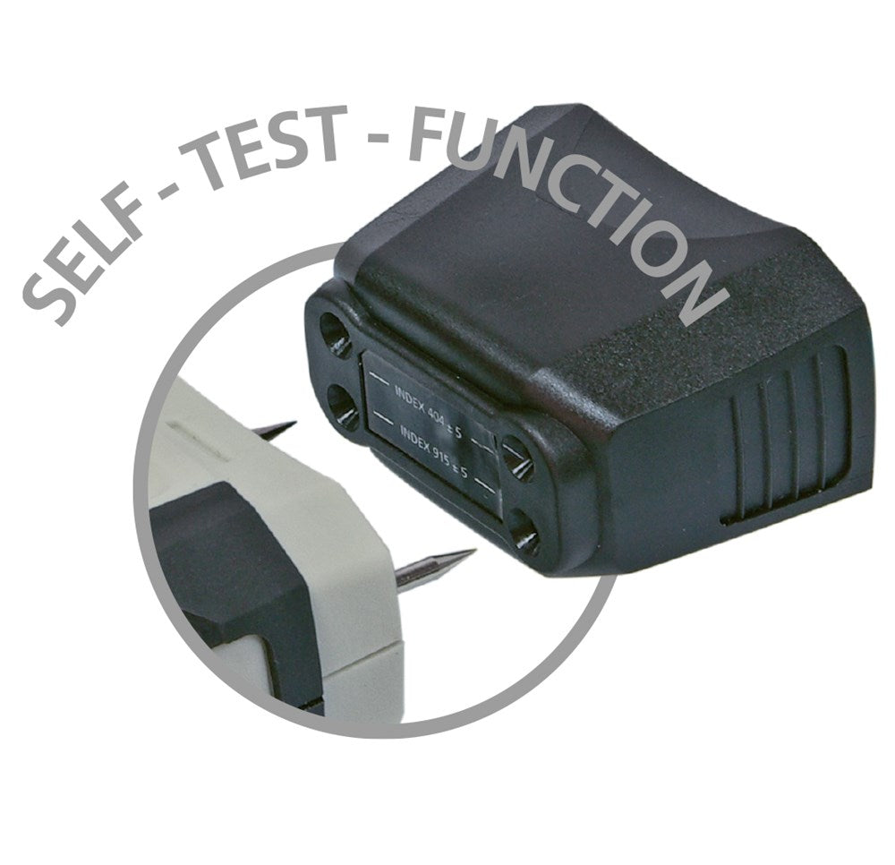 Set bevat: Beschermkap met zelftestfunctie en batterijen, geschikt voor het meten van vocht in hout en bouwmaterialen.