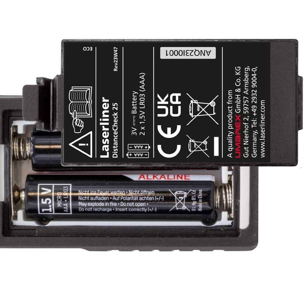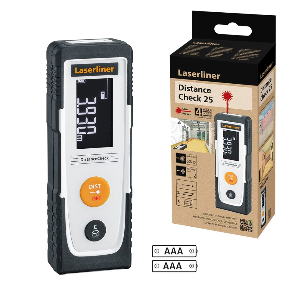 Set bevat: compacte laserafstandsmeter voor nauwkeurige metingen tot 25m, inclusief batterijen voor direct gebruik.