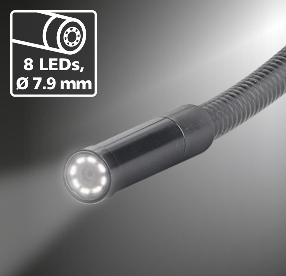 Set bevat: Inspectiecamera met 7,9mm camerakop en flexibele kabel voor diverse toepassingen, inclusief LED-verlichting voor gebruik bij weinig licht.