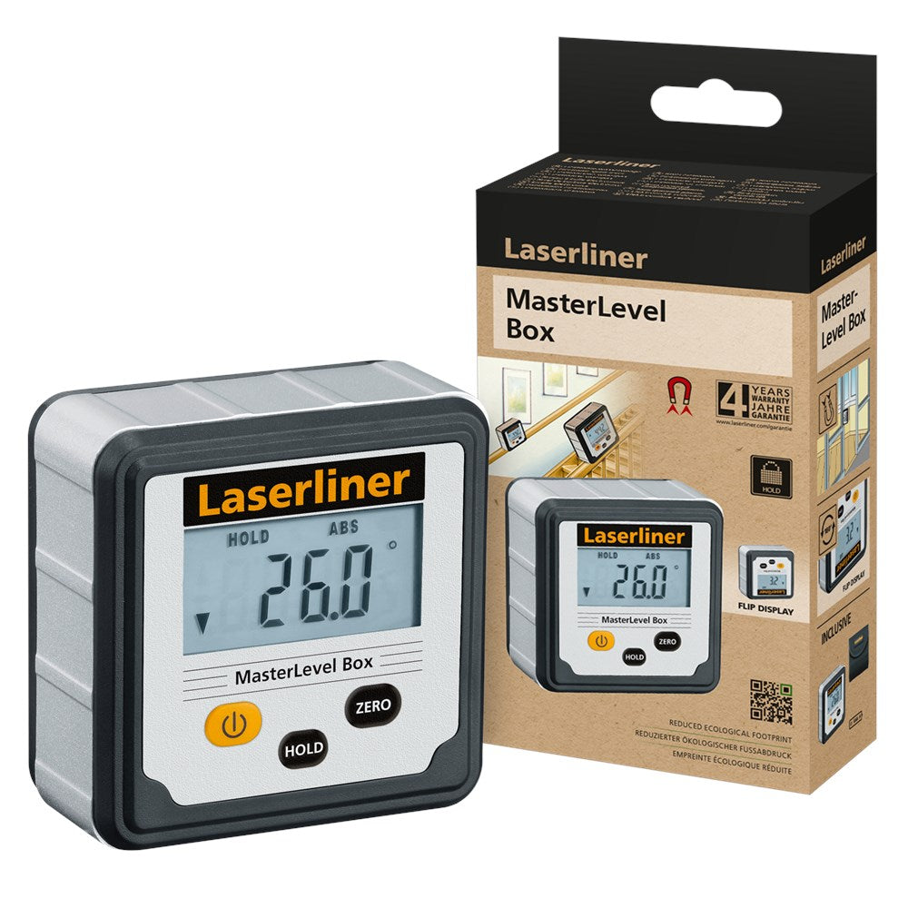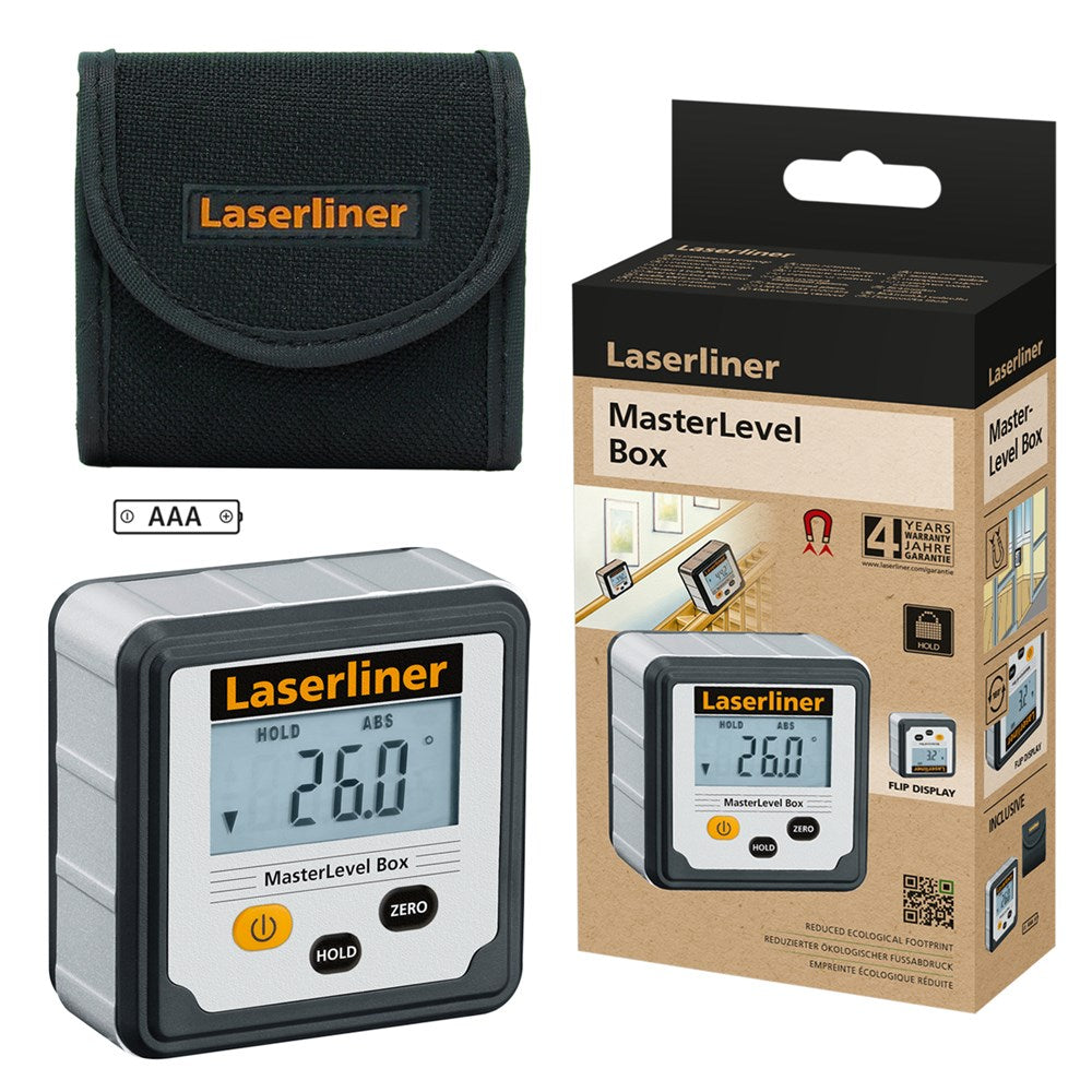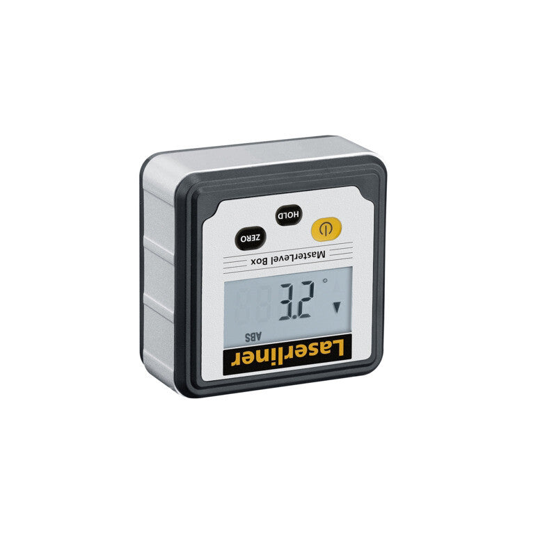 Set bevat: Compacte digitale waterpas met 360°-hoekweergave en referentiefunctie, inclusief transporttas en batterij.