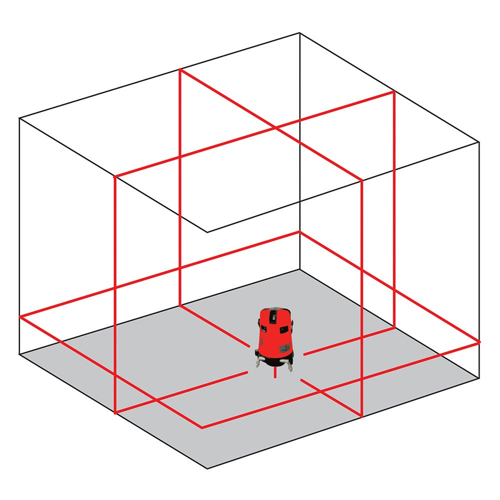 De LEVELFIX CL618R is een gemotoriseerde lijnlaser met fijninstelling en projecteert een rode horizontale 360° lijn, 4 verticale lijnen onder 90° en een oploodpunt