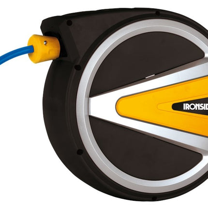 Slagvast kunststof behuizing met stalen muurbeugel. Voorzien van soepele slang, geschikt voor lucht of water. Het oprolmechanisme kan automatische blokkeren of onder spanning blijven. Voorzien van snelkoppeling past op Orion en Euro. Technische specifi...