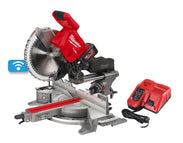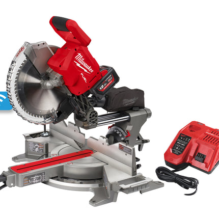 Afkortzaagmachine, geleverd met accu en lader. Inclusief zaagblad 305mm, klem, moersleutel, zijgrepen en stofzak.