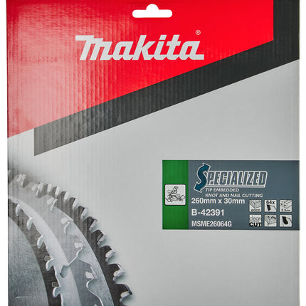 Het Makita B-42391 afkortzaagblad is 305 mm groot, met 60 tanden en een asgat van 30 mm. Speciaal ontworpen voor hout met noesten en spijkers.