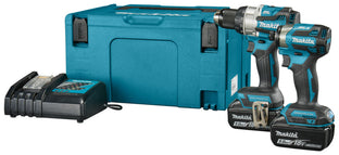 Set bevat: DDF489 boor-/schroefmachine en DTD173 slagschroevendraaier, inclusief 2 x 5,0Ah accu's, snellader, draaghaak en Mbox koffer.