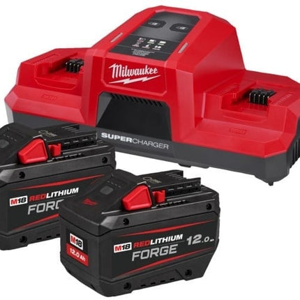 Milwaukee M18 FORGENRG-122DBSC kit met twee 12,0 Ah accu's en snellader, ideaal voor zware professionele toepassingen met langdurige kracht en snel opladen.