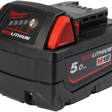 Milwaukee M18B5-CR 5.0 Ah batterij, met chemisch bestendige behuizing en geschikt voor extreme omstandigheden. Biedt 2,5x meer looptijd en 20% meer vermogen voor M18-gereedschappen.