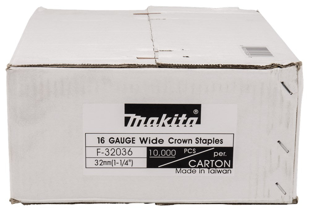 Makita 16 Gauge nieten 32mm 26,6x1,35x1,57mm (Wide Crown). Verpakkingseenheid: 10,000 stuks.
