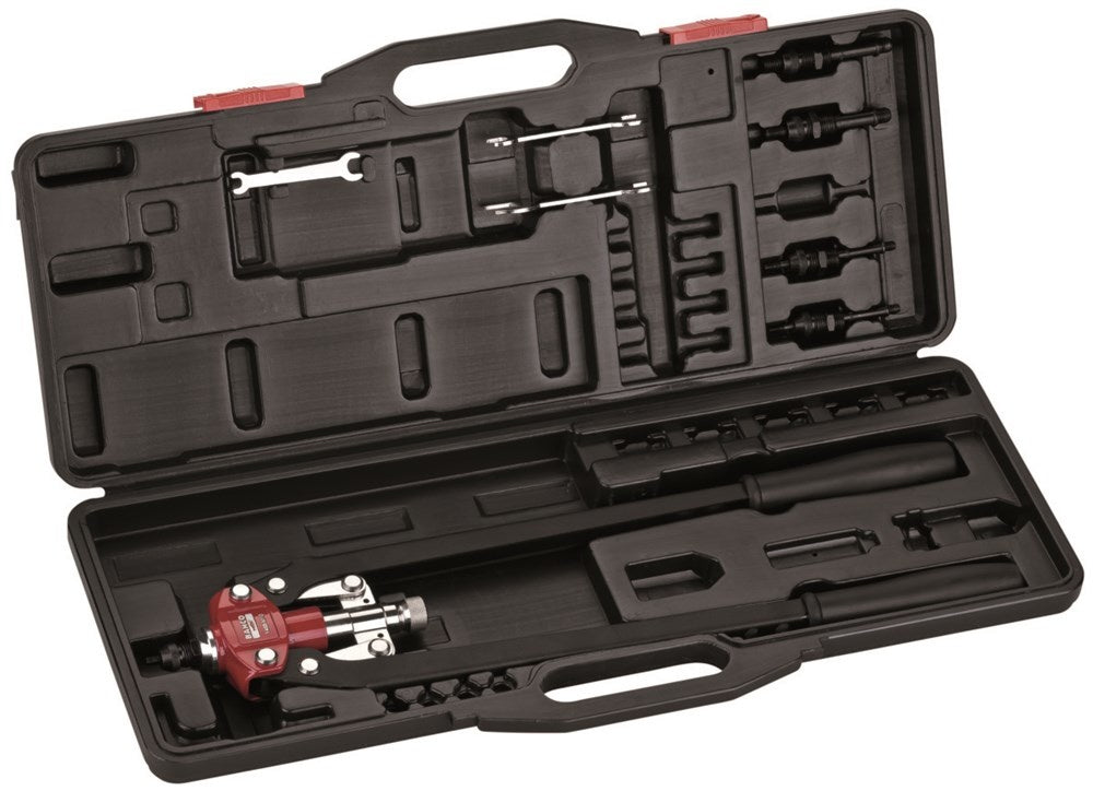 Meegeleverd met inzetstukken voor verschillende klinknagelformaten, evenals de benodigde gereedschappen om deze inzetstukken te (de)monteren. Lees meer