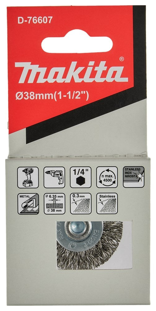 Makita rondborstel 38mm met 1/4" vorm E aansluiting. Deze rondborstel heeft geplooid RVS draad en is uitstekend geschikt voor het reinigen en verwijderen van verf, roest, aanslag en schilfers, of voor het ontbramen van RVS en staal. Ook geschikt voor h...