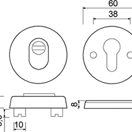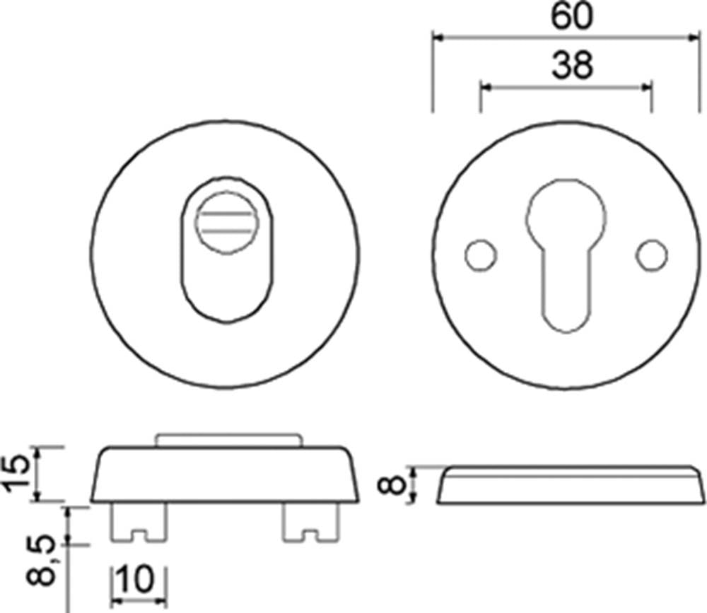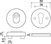 Buitenrozet voorzien van rvs kerntrekbeveiliging. Dikte buitenrozet 15 mm en dikte binnenschild 8 mm. Rozet Ø 60 mm. Met profielcilindergat.Met blinde bevestiging van binnenuit d.m.v. twee rvs schroeven M6x53 mm..