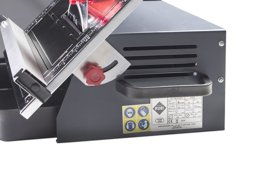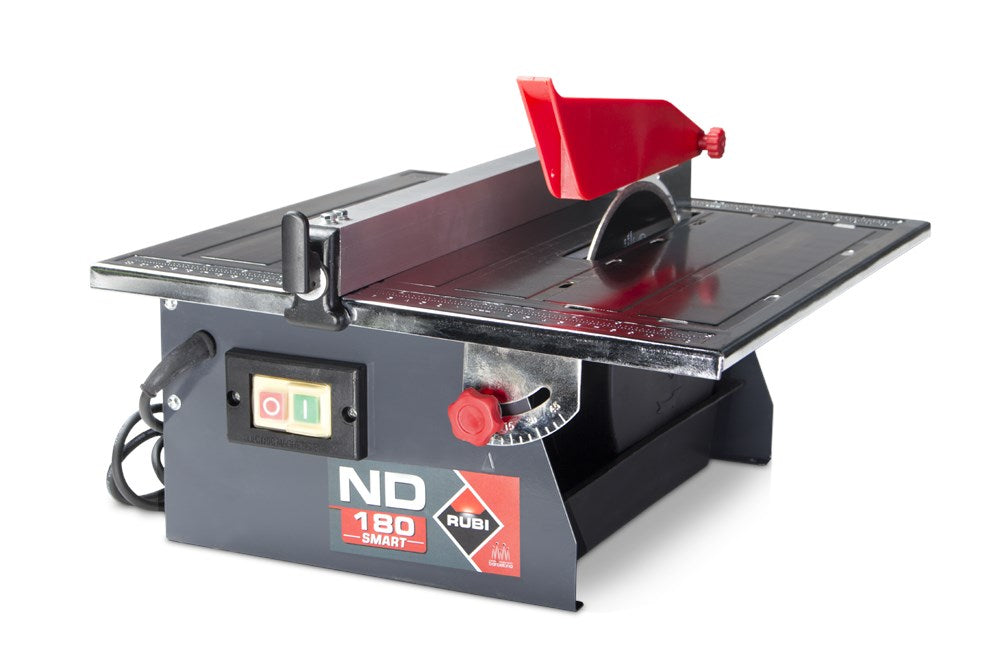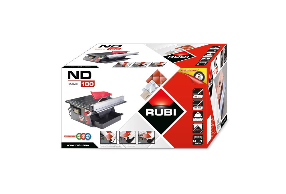De ND-180 elektrische cirkelzaag met verstekmogelijkheid valt in de categorie draagbare zaagmachines.Door zijn kleine afmetingen (39,5 x 38,5 x 24,5 cm) en lichte gewicht (11,8 kg) is het een ideale elektrische zaag en verstekzaag voor afwerkings- en renovatiewerkzaamheden. Hij stelt de professionele tegelzetter in staat om altijd ter plaatse de nodige zaagsneden te maken, waardoor verplaatsingen, correcties en stilstandtijd worden beperkt.Zijn lage waterverbruik en de mogelijkheid om hem uit te rusten met een werkblad (accessoire niet inbegrepen) maken het een van de schoonste verstekzagen op de markt.Zijn 0,7 HP eenfasemotor heeft een thermische beveiliging die hem beschermt tegen momenten van overbelasting.De ND-180 is uitgerust met een schijf met een diameter van 180 mm, type CEV, voor het zagen van keramische tegels.De metalen tafel is verstelbaar en kan tot 45° versteld worden voor verstekzagen.De ND-180 zaag heeft ook een zijaanslag voor repetitieve zaagsneden en een geleider voor 45° schuine zaagsneden.Voor gebruikers die de voorkeur geven aan een betere transporteerbaarheid en een betere bescherming van deze zaagmachine, is er een versie met een draagtas die een extra tweede diamantblad bevat. De koffer kan ook worden gebruikt als steuntafel voor de ND-180.Als onderdeel van zijn strategie doet RUBI voortdurend onderzoek op basis van de evolutie van de materialen en de behoeften die worden ontvangen van de belangrijkste fabrikanten van keramische tegels wereldwijd, van de bijna 30.000 RUBI distributeurs en van de meer dan 40.000 eindgebruikers die zijn geregistreerd in de RUBI Club. Dankzij dit alles biedt RUBI de professionele tegelzetter het meest complete en aangepaste assortiment gereedschappen op de markt. Alles wat je nodig hebt voor alle fasen van het plaatsen van tegels.
