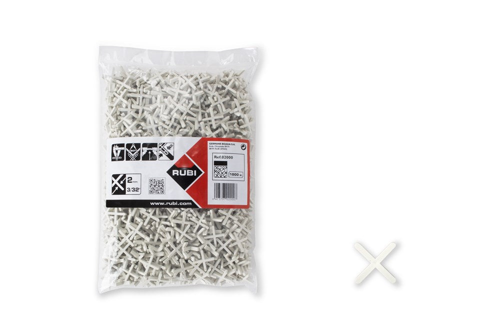 De RUBI tegelvoegkruisjes vormen zonder twijfel een echt onmisbaar hulpmiddel voor het verkrijgen van een perfecte afwerking bij de plaatsing van keramische tegels.RUBI vervaardigt de tegelvoegkruisjes uit hoogwaardig basismateriaal en daarom hebben zij geen enkele vorm van onvolkomenheden of bramen.De 1, 1,5, 2 en 3 mm voegafstandhouders worden aanbevolen voor het plaatsen van keramische wand- en vloertegels met een minimale voeg. De solide structuur van de 1, 1,5, 2 en 3 mm tegelkruisjes is ontworpen om meer weerstand te bieden tegen buigen. Deze eigenschappen maken de 1, 1,5, 2 en 3 mm tegelvoegkruisjes zeer aan te bevelen voor grootformaat keramische tegels.De L (lange) versies van de 2 en 3 mm tegelvoegkruisjes zijn perfect voor zowel wand- als vloertegels, met name grote gerectificeerde keramische tegels met een fijne voeg.De interne geometrie van de 3 mm lange en 4 mm lange tegelvoegkruisjes is ontworpen om meer weerstand te bieden tegen buigen. Deze eigenschappen maken de 3 mm lange voegkruisjes zeer aan te bevelen voor grootformaat keramische tegels.De interne geometrie van de tegelvoegkruisjes voor 5 tot 12 mm voegen is hol en heeft een inwendig versterkt ontwerp waardoor ze bestand zijn tegen spanningen. Dit holle ontwerp vergemakkelijkt de invoer van de voegmortel en laat, als het type werk dit toelaat, het kruisje in de tegel-tot-tegelvoeg achter zonder dat dit de integriteit van de voeg in de toekomst aantast.De versterkte 5 mm tegelvoegkruisjes van RUBI zijn stijvere kruisjes, speciaal ontworpen voor gebruik in grootformaat tegelvloeren. De onderzijde van de versterkte 5 mm kruisjes is zo ontworpen dat ze goed in het voegmateriaal passen en dat het voegkruisje, als het type werk het toelaat, binnen de tegelvoeg kan blijven zonder de integriteit van de voeg in de toekomst aan te tasten.De RUBI tegelvoegkruisjes onderscheiden zich door de regelmatigheid van hun productie, de homogeniteit van de metingen en de afwezigheid van bramen en andere kleine gebreken. Met deze eigenschappen kunnen de professionals die vertrouwen op RUBI tegelvoegkruisjes, T-stukken en keggen een uitstekende afwerking verkrijgen met totale precisie.