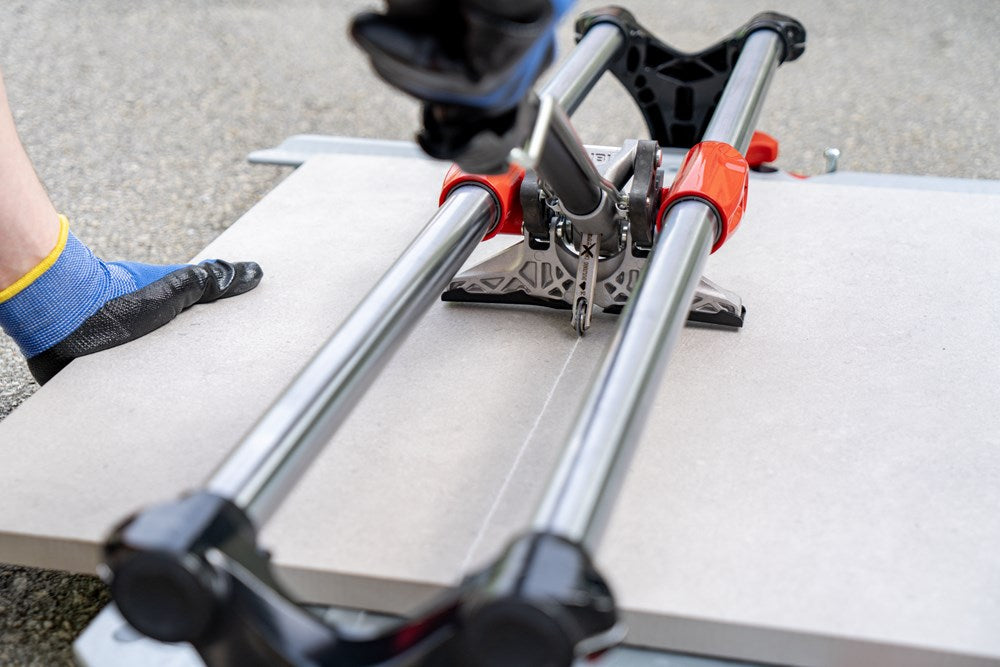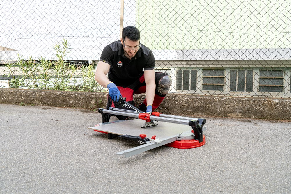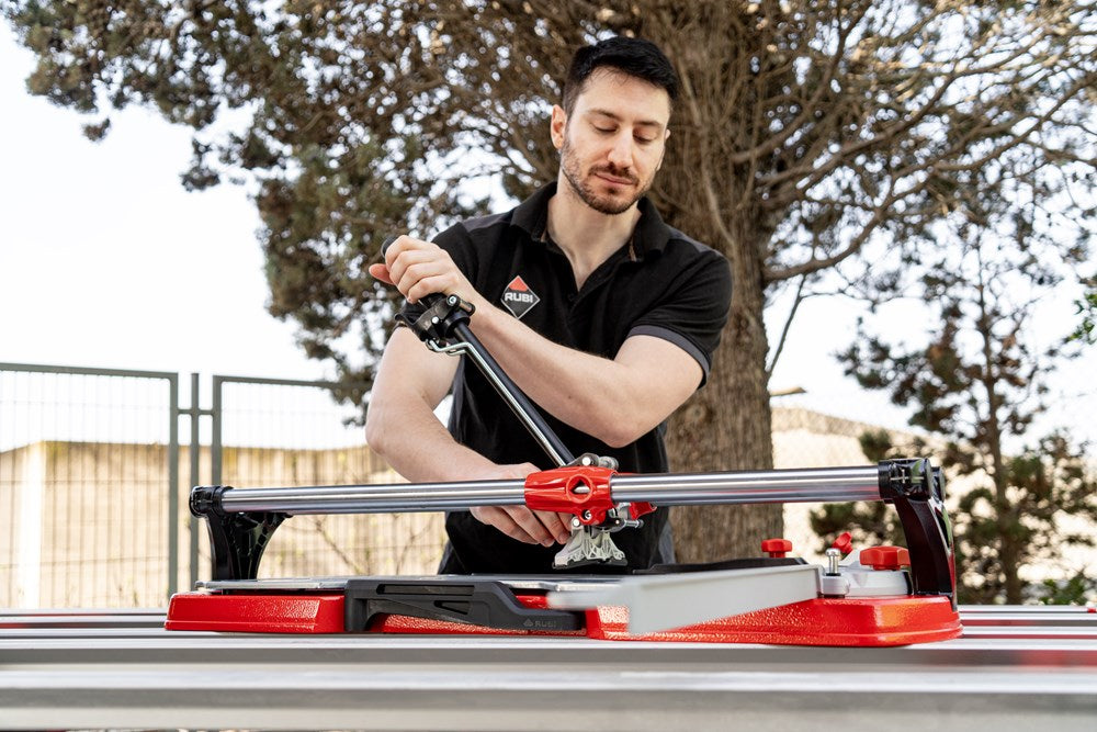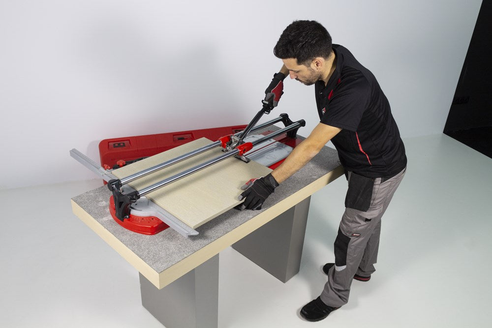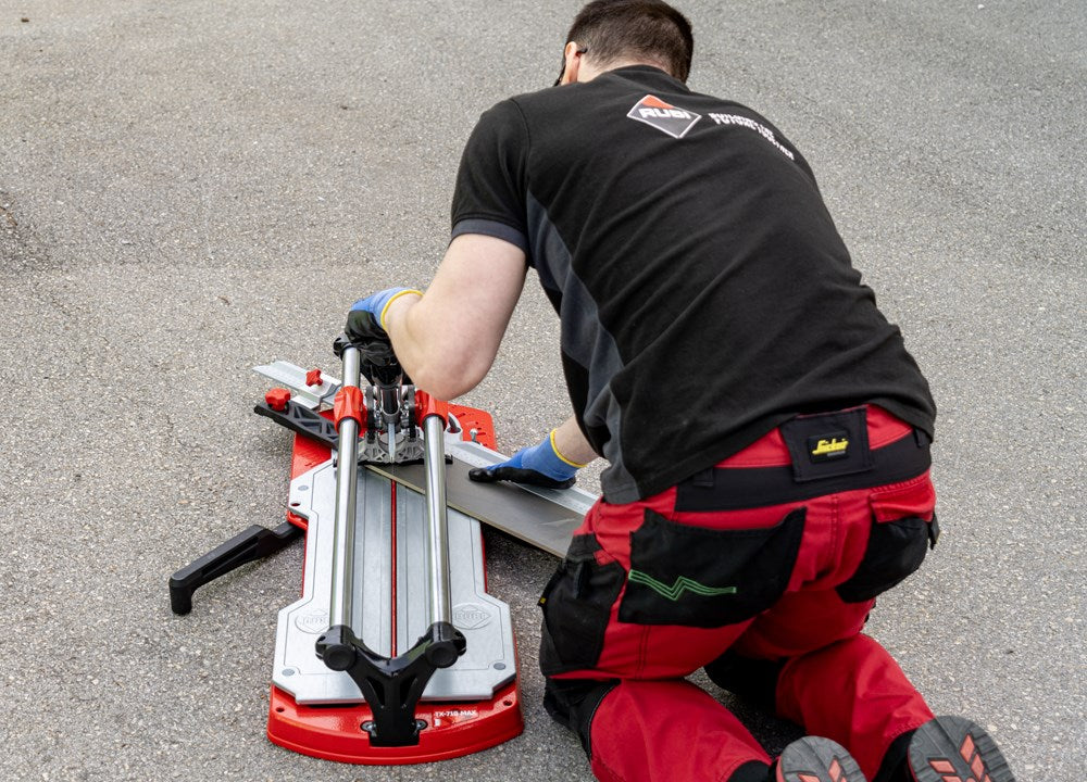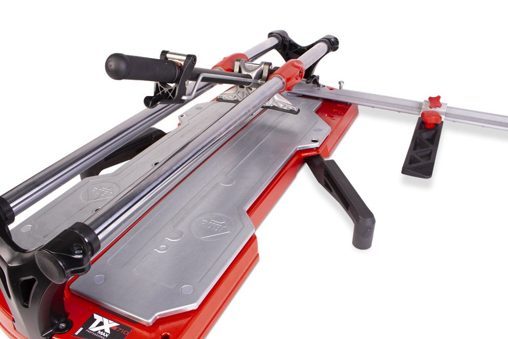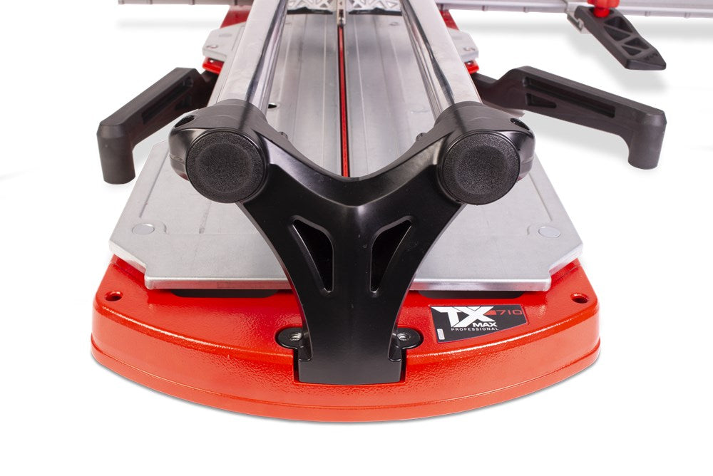 De professionele tegelsnijders uit de TX-MAX serie zijn perfect voor het INTENSIEF snijden van alle soorten keramische tegels. Dankzij hun krachtige mobiele breker en hun vooraanslag met centrale draai-as maken de TX-MAX-modellen een eenvoudige en snelle uitvoering van hoeksneden (van 0º tot 45º) mogelijk, vooral in porseleinen tegels. Dankzij de grote breekkracht (tot 1200 kg) kunnen de TX-MAX tegelsnijders ook gres heel goed aan.De 30 mm diameter van de stalen geleiders en de extra lange aluminium snijkop zorgen voor een indrukwekkende robuustheid, waardoor de modellen met een hogere snijcapaciteit (TX-1020 MAX en TX-1250 MAX) optimaal tot hun recht komen.De geavanceerde positie van het snijwieltje verhoogt de zichtbaarheid tijdens het snijden en het breken, en de breekvleugel is voorzien van een afneembare beschermer die het mogelijk maakt om markering op de meest delicate oppervlakken te voorkomen.De vergrendeling van de breekvleugel, door middel van een ratelmechanisme, en de ontgrendeling, door middel van een trekker, maakt het mogelijk om met slechts één hand te snijden en te breken.Als aanvulling op de zwevende breekplaten zijn de modellen 710 en 1020 uitgerust met twee extra zijsteunen om het steunvlak voor grootformaat tegels te vergroten. Model 1250 heeft 4 steunen (twee aan elke kant).Alle modellen uit de TX-MAX-serie zijn voorzien van een zijaanslag voor repeterende sneden en smalle stroken, ook zijn twee snijwieltjes (8 mm en 22 mm EXTREME) en de transportkoffer inbegrepen. De TX-MAX tegelsnijders zijn compatibel met het volledige PLUS snijwieltjesassortiment van RUBI. Het model TX-1250 MAX bevat naast de koffer ook handgrepen en wielen voor eenvoudige hanteerbaarheid op de werkplek.*Er zijn enkele keramische materialen, met een dikte van meer dan 15 mm, die vanwege hun fysische eigenschappen, mogelijke interne spanningen of afwerking moeilijk te snijden zijn. Het wordt aangeraden om enkele proefsneden te maken te maken om de comptabiliteit van het product te bepalen.