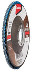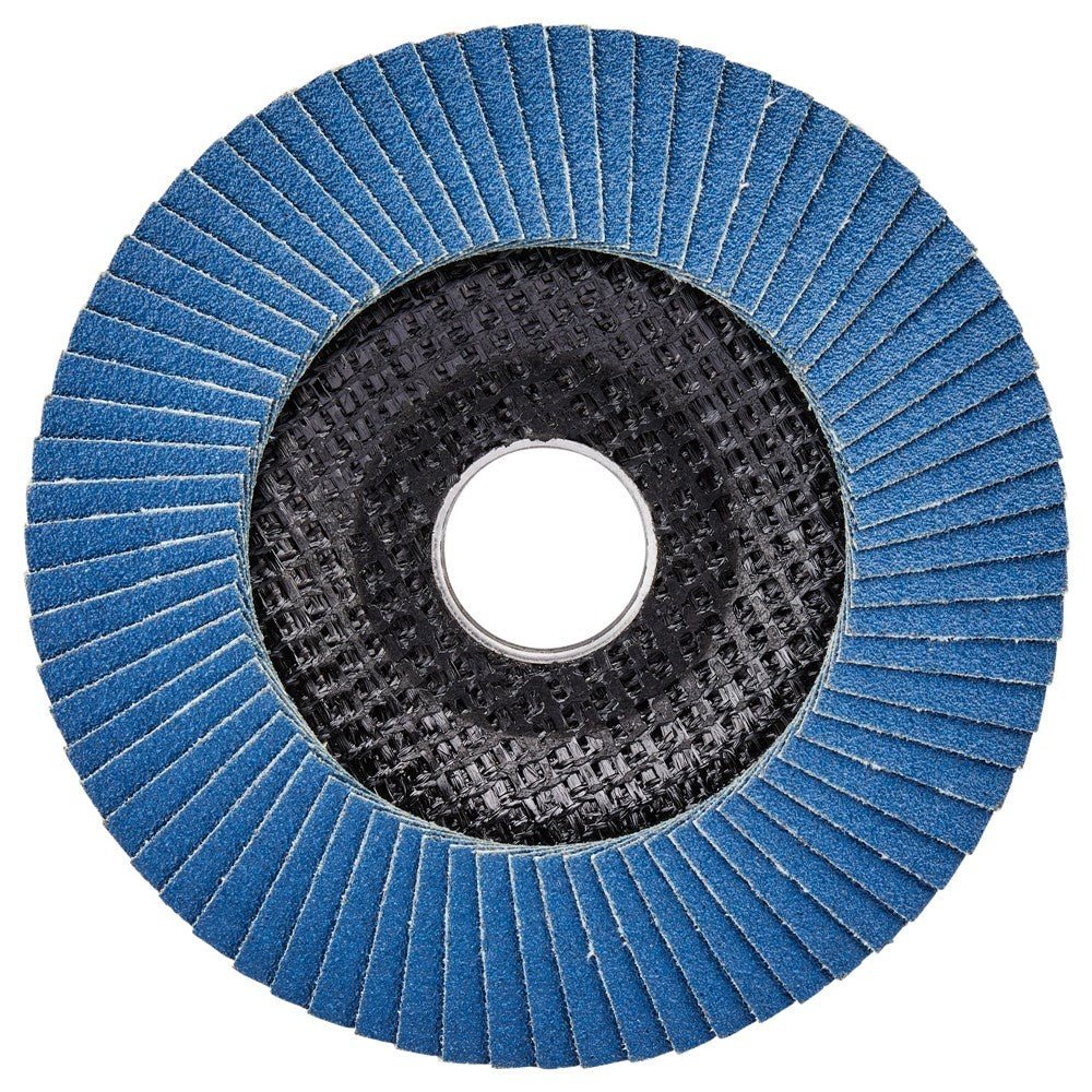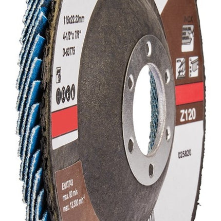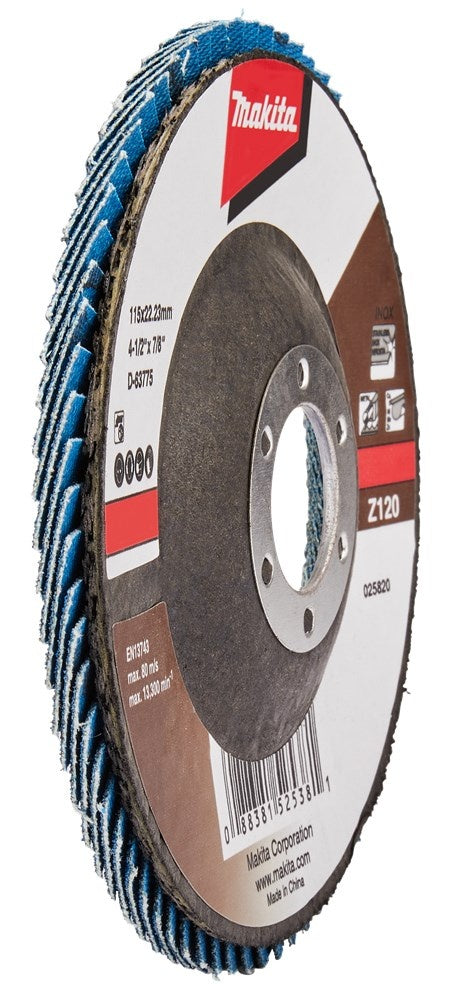 Lamellenschuurschijven zijn voorzien van lamellen bestaande uit een rug van vezelstof en korrels. Deze zijn geplaatst op een schijf met een rug van glasvezels. Doordat de schijf opgebouwd is uit lamellen is deze veerkrachtiger dan een schuurschijf en minder agressief voor het te bewerken materiaal. Bijzonder geschikt voor het schuren van lasnaden. Soorten korrel: Aluminiumoxide [A]: Zeer geschikt voor staal. Geschikt voor aluminium, non-ferro metalen en kunststoffen. Zirkoniumoxide [Z]: Zeer geschikt voor RVS. Geschikt voor staal, aluminium en non-ferro metalen. Keramisch aluminiumoxide [Ce]: Zeer geschikt voor RVS. Geschikt voor staal, aluminium en non-ferro metalen. Siliciumcarbide [S]: Zeer geschikt voor mortel en steen. Vom van de schijf: Vlakke schijven gebruik je voor het vlakschuren van oppervlakken. Plaatst deze onder een hoek van 0-15° op het materiaal voor een optimaal gebruik. Schuine schijven gebruik je voor het schuren van lasnaden, slijpen van vellingkanten en ontbramen. Plaats deze onder een hoek van 10-25° op het materiaal voor een optimaal gebruik. Korrels: 36/40: Lasnaadbewerking en vellingkanten. 60: Lasnaadbewerking, vellingkanten, ontbramen en vlakschuren. 80: Ontbramen en vlakschuren. 120: Vlakschuren. Voordelige Makita zirkonium-aluminiumoxide lamellenschuurschijf schuin met glasvezel versterkte rug. Diameter 115mm met korrel 120. Zeer geschikt voor: metaal. Geschikt voor: RVS en non-ferro metalen. Voor intensief gebruik raden wij lamellenschuurschijf B-22654 of D-27464 aan. Tevens verkrijgbaar in 10-pack D-63775-10.