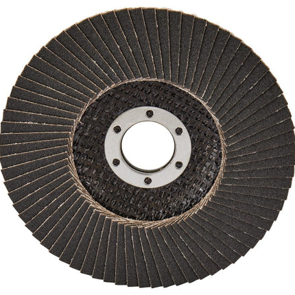 Lamellenschuurschijven zijn voorzien van lamellen bestaande uit een rug van vezelstof en korrels. Deze zijn geplaatst op een schijf met een rug van glasvezels. Doordat de schijf opgebouwd is uit lamellen is deze veerkrachtiger dan een schuurschijf en minder agressief voor het te bewerken materiaal. Bijzonder geschikt voor het schuren van lasnaden. Soorten korrel: Aluminiumoxide [A]: Zeer geschikt voor staal. Geschikt voor aluminium, non-ferro metalen en kunststoffen. Zirkoniumoxide [Z]: Zeer geschikt voor RVS. Geschikt voor staal, aluminium en non-ferro metalen. Keramisch aluminiumoxide [Ce]: Zeer geschikt voor RVS. Geschikt voor staal, aluminium en non-ferro metalen. Siliciumcarbide [S]: Zeer geschikt voor mortel en steen. Vom van de schijf: Vlakke schijven gebruik je voor het vlakschuren van oppervlakken. Plaatst deze onder een hoek van 0-15° op het materiaal voor een optimaal gebruik. Schuine schijven gebruik je voor het schuren van lasnaden, slijpen van vellingkanten en ontbramen. Plaats deze onder een hoek van 10-25° op het materiaal voor een optimaal gebruik. Korrels: 36/40: Lasnaadbewerking en vellingkanten. 60: Lasnaadbewerking, vellingkanten, ontbramen en vlakschuren. 80: Ontbramen en vlakschuren. 120: Vlakschuren. Makita silicium-carbide lamellenschuurschijf schuin met glasvezel versterkte rug. Diameter 125mm met korrel 120. Zeer geschikt voor: steen.