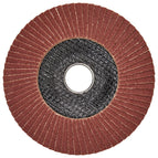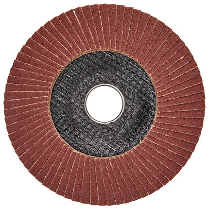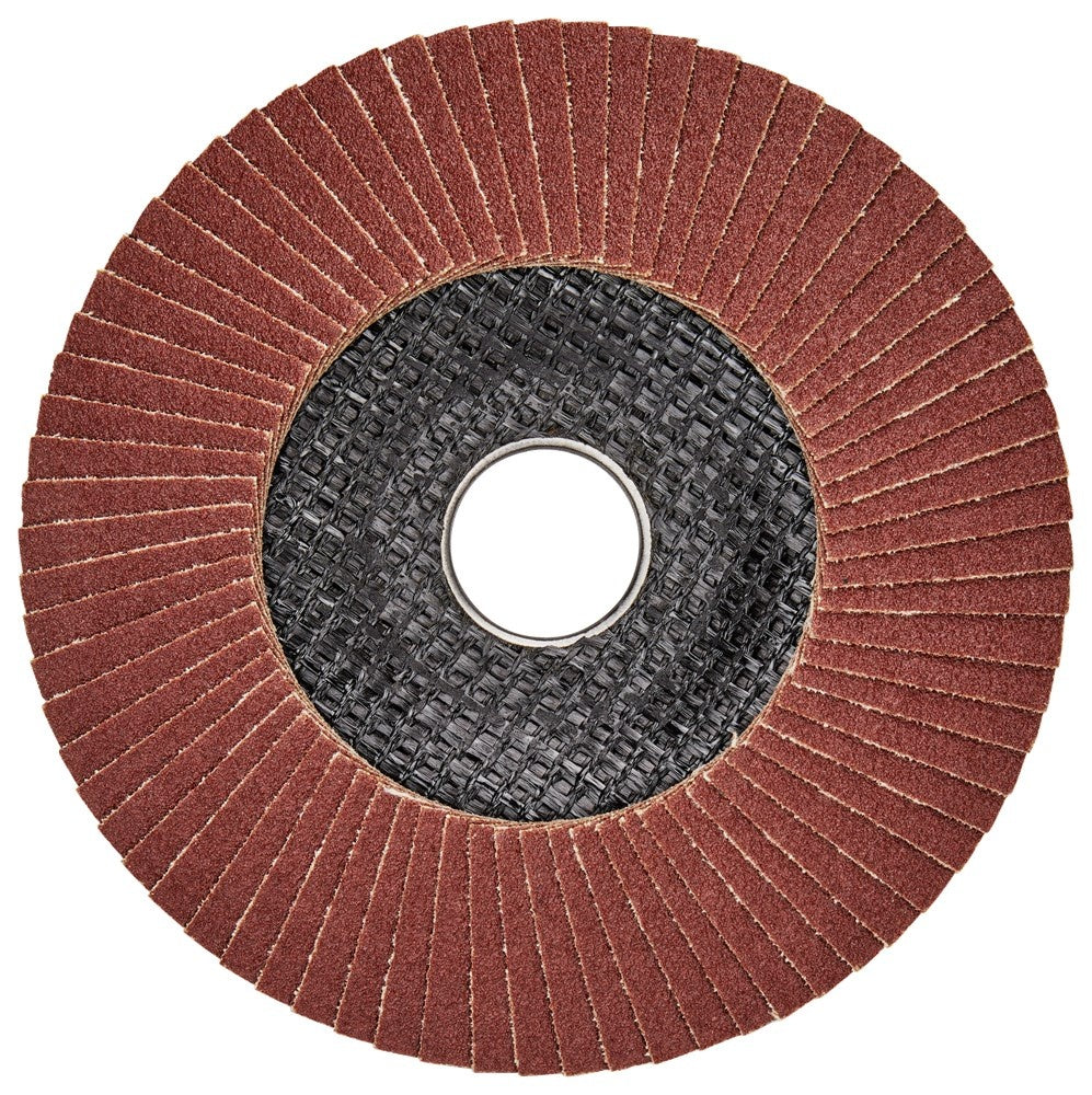 Lamellenschuurschijven zijn voorzien van lamellen bestaande uit een rug van vezelstof en korrels. Deze zijn geplaatst op een schijf met een rug van glasvezels. Doordat de schijf opgebouwd is uit lamellen is deze veerkrachtiger dan een schuurschijf en minder agressief voor het te bewerken materiaal. Bijzonder geschikt voor het schuren van lasnaden. Soorten korrel: Aluminiumoxide [A]: Zeer geschikt voor staal. Geschikt voor aluminium, non-ferro metalen en kunststoffen. Zirkoniumoxide [Z]: Zeer geschikt voor RVS. Geschikt voor staal, aluminium en non-ferro metalen. Keramisch aluminiumoxide [Ce]: Zeer geschikt voor RVS. Geschikt voor staal, aluminium en non-ferro metalen. Siliciumcarbide [S]: Zeer geschikt voor mortel en steen. Vom van de schijf: Vlakke schijven gebruik je voor het vlakschuren van oppervlakken. Plaatst deze onder een hoek van 0-15° op het materiaal voor een optimaal gebruik. Schuine schijven gebruik je voor het schuren van lasnaden, slijpen van vellingkanten en ontbramen. Plaats deze onder een hoek van 10-25° op het materiaal voor een optimaal gebruik. Korrels: 36/40: Lasnaadbewerking en vellingkanten. 60: Lasnaadbewerking, vellingkanten, ontbramen en vlakschuren. 80: Ontbramen en vlakschuren. 120: Vlakschuren. Voordelige Makita aluminiumoxide lamellenschuurschijf schuin met glasvezel versterkte rug. Diameter 125mm met korrel 120. Zeer geschikt voor: metaal. Geschikt voor: kunststof, non-ferro metalen en hout. Voor intensief gebruik raden wij de lamellenschijf D-27115 aan. Tevens verkrijgbaar in voordelig 10-pack D-63507-10.