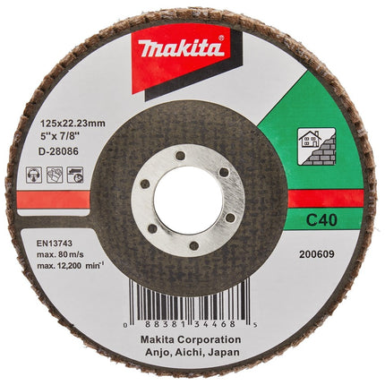 Lamellenschuurschijven zijn voorzien van lamellen bestaande uit een rug van vezelstof en korrels. Deze zijn geplaatst op een schijf met een rug van glasvezels. Doordat de schijf opgebouwd is uit lamellen is deze veerkrachtiger dan een schuurschijf en minder agressief voor het te bewerken materiaal. Bijzonder geschikt voor het schuren van lasnaden. Soorten korrel: Aluminiumoxide [A]: Zeer geschikt voor staal. Geschikt voor aluminium, non-ferro metalen en kunststoffen. Zirkoniumoxide [Z]: Zeer geschikt voor RVS. Geschikt voor staal, aluminium en non-ferro metalen. Keramisch aluminiumoxide [Ce]: Zeer geschikt voor RVS. Geschikt voor staal, aluminium en non-ferro metalen. Siliciumcarbide [S]: Zeer geschikt voor mortel en steen. Vom van de schijf: Vlakke schijven gebruik je voor het vlakschuren van oppervlakken. Plaatst deze onder een hoek van 0-15° op het materiaal voor een optimaal gebruik. Schuine schijven gebruik je voor het schuren van lasnaden, slijpen van vellingkanten en ontbramen. Plaats deze onder een hoek van 10-25° op het materiaal voor een optimaal gebruik. Korrels: 36/40: Lasnaadbewerking en vellingkanten. 60: Lasnaadbewerking, vellingkanten, ontbramen en vlakschuren. 80: Ontbramen en vlakschuren. 120: Vlakschuren. Makita silicium-carbide lamellenschuurschijf schuin met glasvezel versterkte rug. Diameter 125mm met korrel 40. Zeer geschikt voor: steen.