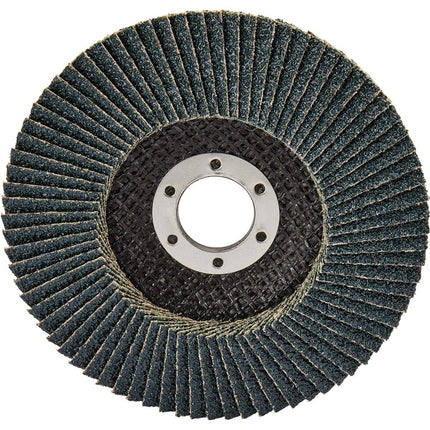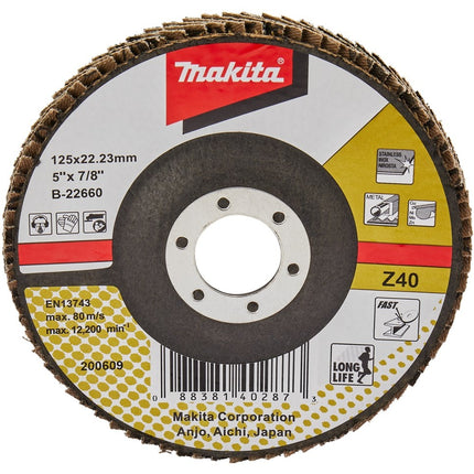 Lamellenschuurschijven zijn voorzien van lamellen bestaande uit een rug van vezelstof en korrels. Deze zijn geplaatst op een schijf met een rug van glasvezels. Doordat de schijf opgebouwd is uit lamellen is deze veerkrachtiger dan een schuurschijf en minder agressief voor het te bewerken materiaal. Bijzonder geschikt voor het schuren van lasnaden. Soorten korrel: Aluminiumoxide [A]: Zeer geschikt voor staal. Geschikt voor aluminium, non-ferro metalen en kunststoffen. Zirkoniumoxide [Z]: Zeer geschikt voor RVS. Geschikt voor staal, aluminium en non-ferro metalen. Keramisch aluminiumoxide [Ce]: Zeer geschikt voor RVS. Geschikt voor staal, aluminium en non-ferro metalen. Siliciumcarbide [S]: Zeer geschikt voor mortel en steen. Vom van de schijf: Vlakke schijven gebruik je voor het vlakschuren van oppervlakken. Plaatst deze onder een hoek van 0-15° op het materiaal voor een optimaal gebruik. Schuine schijven gebruik je voor het schuren van lasnaden, slijpen van vellingkanten en ontbramen. Plaats deze onder een hoek van 10-25° op het materiaal voor een optimaal gebruik. Korrels: 36/40: Lasnaadbewerking en vellingkanten. 60: Lasnaadbewerking, vellingkanten, ontbramen en vlakschuren. 80: Ontbramen en vlakschuren. 120: Vlakschuren. Hoogkwalitatieve Makita zirkonium-aluminiumoxide lamellenschijf schuin met glasvezel versterkte rug. Diameter 125mm met korrel 40. Zeer geschikt voor: metaal. Geschikt voor: RVS en non-ferro metalen.