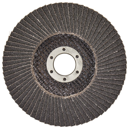 Lamellenschuurschijven zijn voorzien van lamellen bestaande uit een rug van vezelstof en korrels. Deze zijn geplaatst op een schijf met een rug van glasvezels. Doordat de schijf opgebouwd is uit lamellen is deze veerkrachtiger dan een schuurschijf en minder agressief voor het te bewerken materiaal. Bijzonder geschikt voor het schuren van lasnaden. Soorten korrel: Aluminiumoxide [A]: Zeer geschikt voor staal. Geschikt voor aluminium, non-ferro metalen en kunststoffen. Zirkoniumoxide [Z]: Zeer geschikt voor RVS. Geschikt voor staal, aluminium en non-ferro metalen. Keramisch aluminiumoxide [Ce]: Zeer geschikt voor RVS. Geschikt voor staal, aluminium en non-ferro metalen. Siliciumcarbide [S]: Zeer geschikt voor mortel en steen. Vom van de schijf: Vlakke schijven gebruik je voor het vlakschuren van oppervlakken. Plaatst deze onder een hoek van 0-15° op het materiaal voor een optimaal gebruik. Schuine schijven gebruik je voor het schuren van lasnaden, slijpen van vellingkanten en ontbramen. Plaats deze onder een hoek van 10-25° op het materiaal voor een optimaal gebruik. Korrels: 36/40: Lasnaadbewerking en vellingkanten. 60: Lasnaadbewerking, vellingkanten, ontbramen en vlakschuren. 80: Ontbramen en vlakschuren. 120: Vlakschuren. Makita silicium-carbide lamellenschuurschijf schuin met glasvezel versterkte rug. Diameter 125mm met korrel 60. Zeer geschikt voor: steen.