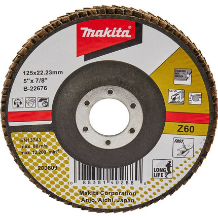 Lamellenschuurschijven zijn voorzien van lamellen bestaande uit een rug van vezelstof en korrels. Deze zijn geplaatst op een schijf met een rug van glasvezels. Doordat de schijf opgebouwd is uit lamellen is deze veerkrachtiger dan een schuurschijf en minder agressief voor het te bewerken materiaal. Bijzonder geschikt voor het schuren van lasnaden. Soorten korrel: Aluminiumoxide [A]: Zeer geschikt voor staal. Geschikt voor aluminium, non-ferro metalen en kunststoffen. Zirkoniumoxide [Z]: Zeer geschikt voor RVS. Geschikt voor staal, aluminium en non-ferro metalen. Keramisch aluminiumoxide [Ce]: Zeer geschikt voor RVS. Geschikt voor staal, aluminium en non-ferro metalen. Siliciumcarbide [S]: Zeer geschikt voor mortel en steen. Vom van de schijf: Vlakke schijven gebruik je voor het vlakschuren van oppervlakken. Plaatst deze onder een hoek van 0-15° op het materiaal voor een optimaal gebruik. Schuine schijven gebruik je voor het schuren van lasnaden, slijpen van vellingkanten en ontbramen. Plaats deze onder een hoek van 10-25° op het materiaal voor een optimaal gebruik. Korrels: 36/40: Lasnaadbewerking en vellingkanten. 60: Lasnaadbewerking, vellingkanten, ontbramen en vlakschuren. 80: Ontbramen en vlakschuren. 120: Vlakschuren. Hoogkwalitatieve Makita zirkonium-aluminiumoxide lamellenschijf schuin met glasvezel versterkte rug. Diameter 125mm met korrel 60. Zeer geschikt voor: metaal. Geschikt voor: RVS en non-ferro metalen.