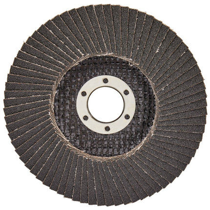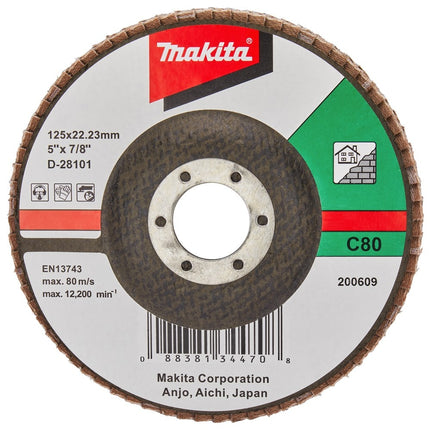 Lamellenschuurschijven zijn voorzien van lamellen bestaande uit een rug van vezelstof en korrels. Deze zijn geplaatst op een schijf met een rug van glasvezels. Doordat de schijf opgebouwd is uit lamellen is deze veerkrachtiger dan een schuurschijf en minder agressief voor het te bewerken materiaal. Bijzonder geschikt voor het schuren van lasnaden. Soorten korrel: Aluminiumoxide [A]: Zeer geschikt voor staal. Geschikt voor aluminium, non-ferro metalen en kunststoffen. Zirkoniumoxide [Z]: Zeer geschikt voor RVS. Geschikt voor staal, aluminium en non-ferro metalen. Keramisch aluminiumoxide [Ce]: Zeer geschikt voor RVS. Geschikt voor staal, aluminium en non-ferro metalen. Siliciumcarbide [S]: Zeer geschikt voor mortel en steen. Vom van de schijf: Vlakke schijven gebruik je voor het vlakschuren van oppervlakken. Plaatst deze onder een hoek van 0-15° op het materiaal voor een optimaal gebruik. Schuine schijven gebruik je voor het schuren van lasnaden, slijpen van vellingkanten en ontbramen. Plaats deze onder een hoek van 10-25° op het materiaal voor een optimaal gebruik. Korrels: 36/40: Lasnaadbewerking en vellingkanten. 60: Lasnaadbewerking, vellingkanten, ontbramen en vlakschuren. 80: Ontbramen en vlakschuren. 120: Vlakschuren. Makita silicium-carbide lamellenschuurschijf schuin met glasvezel versterkte rug. Diameter 125mm met korrel 80. Zeer geschikt voor: steen.