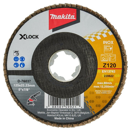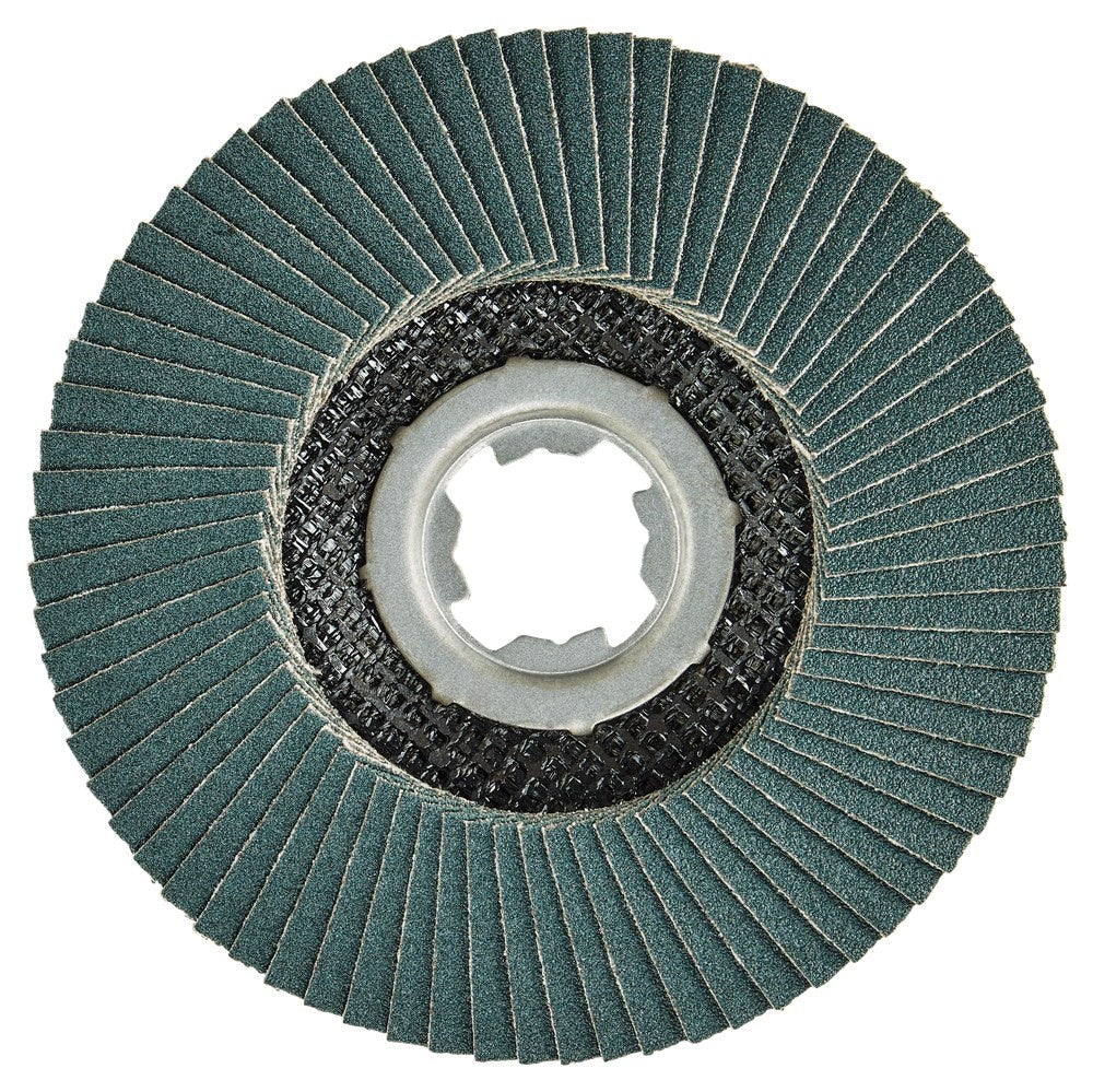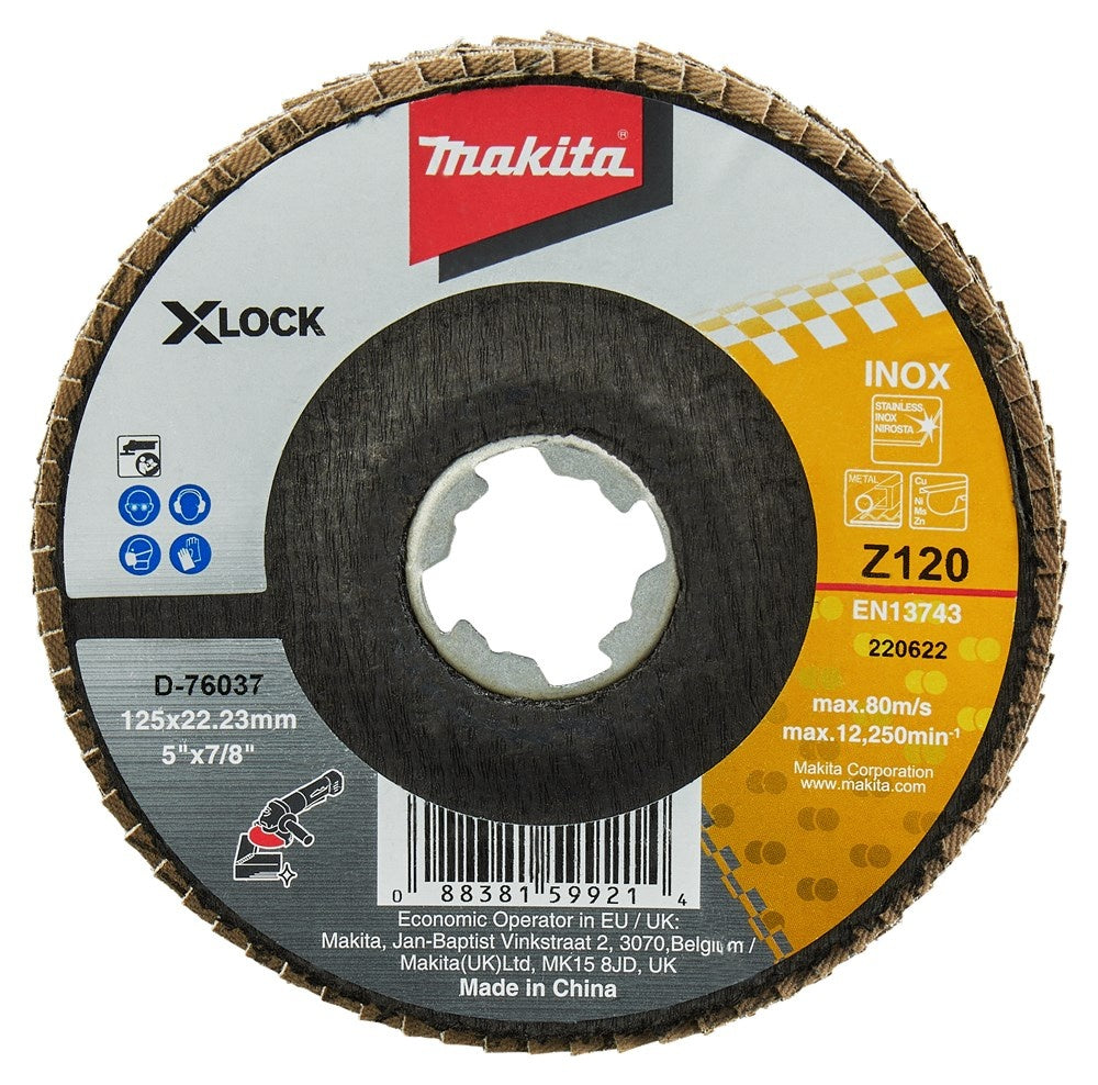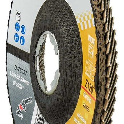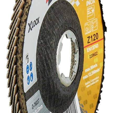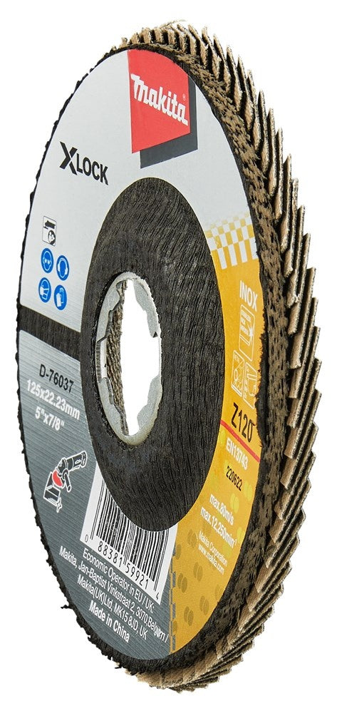Lamellenschuurschijven zijn voorzien van lamellen bestaande uit een rug van vezelstof en korrels. Deze zijn geplaatst op een schijf met een rug van glasvezels. Doordat de schijf opgebouwd is uit lamellen is deze veerkrachtiger dan een schuurschijf en minder agressief voor het te bewerken materiaal. Bijzonder geschikt voor het schuren van lasnaden. Soorten korrel: Aluminiumoxide [A]: Zeer geschikt voor staal. Geschikt voor aluminium, non-ferro metalen en kunststoffen. Zirkoniumoxide [Z]: Zeer geschikt voor RVS. Geschikt voor staal, aluminium en non-ferro metalen. Keramisch aluminiumoxide [Ce]: Zeer geschikt voor RVS. Geschikt voor staal, aluminium en non-ferro metalen. Siliciumcarbide [S]: Zeer geschikt voor mortel en steen. Vom van de schijf: Vlakke schijven gebruik je voor het vlakschuren van oppervlakken. Plaatst deze onder een hoek van 0-15° op het materiaal voor een optimaal gebruik. Schuine schijven gebruik je voor het schuren van lasnaden, slijpen van vellingkanten en ontbramen. Plaats deze onder een hoek van 10-25° op het materiaal voor een optimaal gebruik. Korrels: 36/40: Lasnaadbewerking en vellingkanten. 60: Lasnaadbewerking, vellingkanten, ontbramen en vlakschuren. 80: Ontbramen en vlakschuren. 120: Vlakschuren. Hoogkwalitatieve Makita zirkonium-aluminiumoxide lamellenschijf schuin met glasvezel versterkte rug. Diameter 125mm met korrel 120.