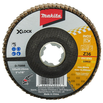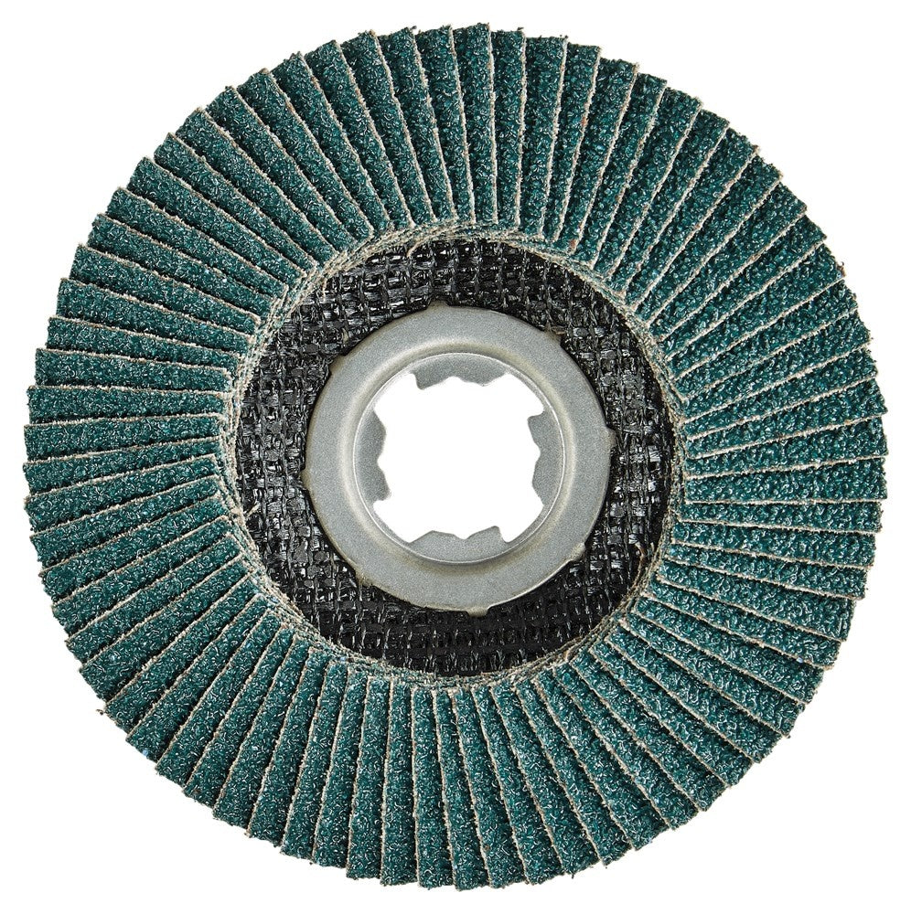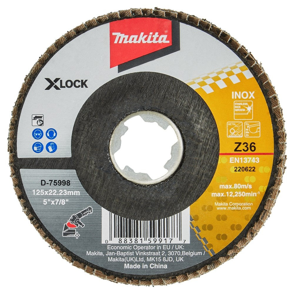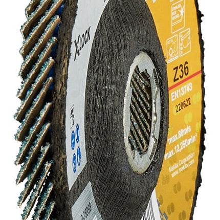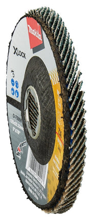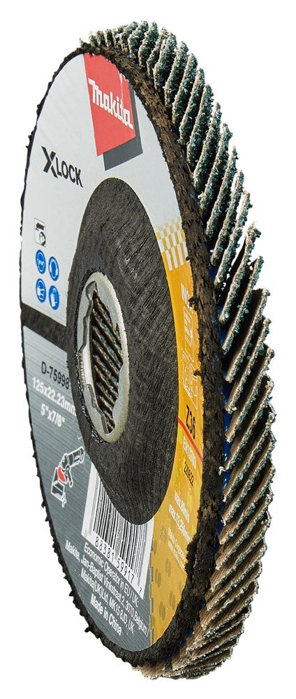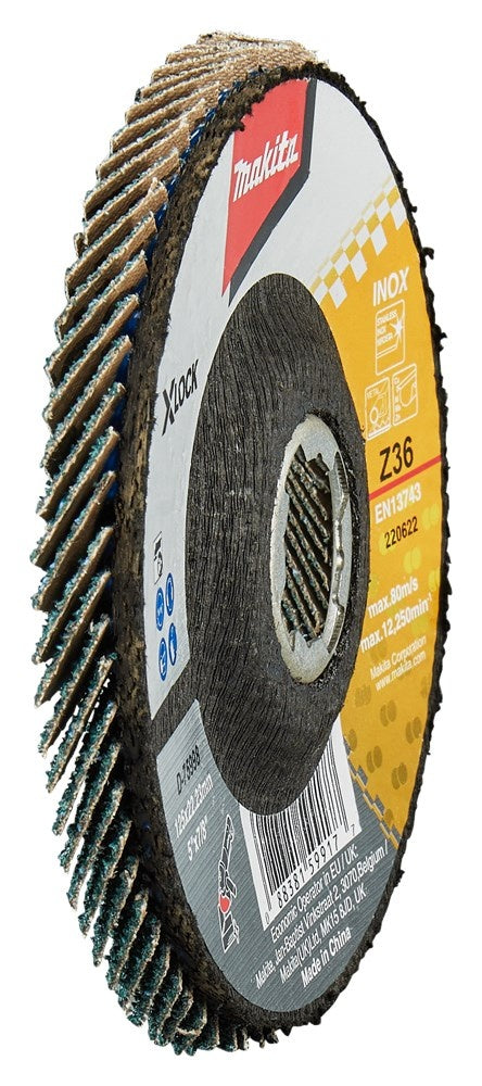 Lamellenschuurschijven zijn voorzien van lamellen bestaande uit een rug van vezelstof en korrels. Deze zijn geplaatst op een schijf met een rug van glasvezels. Doordat de schijf opgebouwd is uit lamellen is deze veerkrachtiger dan een schuurschijf en minder agressief voor het te bewerken materiaal. Bijzonder geschikt voor het schuren van lasnaden. Soorten korrel: Aluminiumoxide [A]: Zeer geschikt voor staal. Geschikt voor aluminium, non-ferro metalen en kunststoffen. Zirkoniumoxide [Z]: Zeer geschikt voor RVS. Geschikt voor staal, aluminium en non-ferro metalen. Keramisch aluminiumoxide [Ce]: Zeer geschikt voor RVS. Geschikt voor staal, aluminium en non-ferro metalen. Siliciumcarbide [S]: Zeer geschikt voor mortel en steen. Vom van de schijf: Vlakke schijven gebruik je voor het vlakschuren van oppervlakken. Plaatst deze onder een hoek van 0-15° op het materiaal voor een optimaal gebruik. Schuine schijven gebruik je voor het schuren van lasnaden, slijpen van vellingkanten en ontbramen. Plaats deze onder een hoek van 10-25° op het materiaal voor een optimaal gebruik. Korrels: 36/40: Lasnaadbewerking en vellingkanten. 60: Lasnaadbewerking, vellingkanten, ontbramen en vlakschuren. 80: Ontbramen en vlakschuren. 120: Vlakschuren. Hoogkwalitatieve Makita zirkonium-aluminiumoxide lamellenschijf schuin met glasvezel versterkte rug. Diameter 125mm met korrel 36.