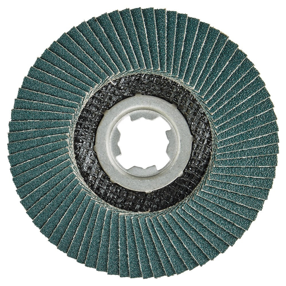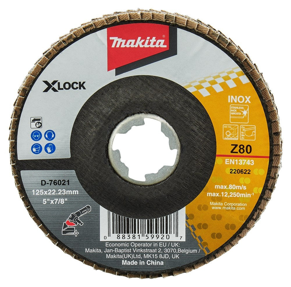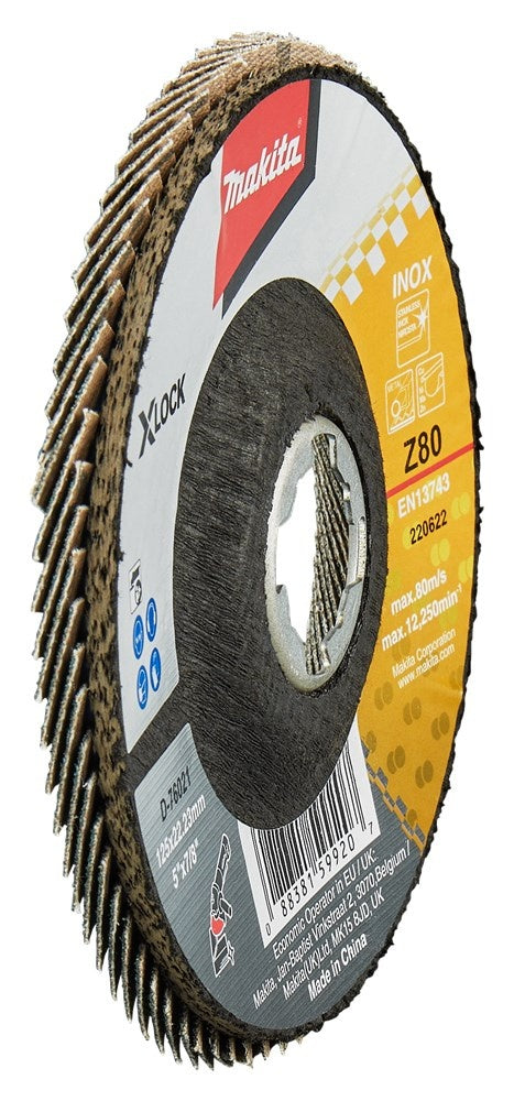 Lamellenschuurschijven zijn voorzien van lamellen bestaande uit een rug van vezelstof en korrels. Deze zijn geplaatst op een schijf met een rug van glasvezels. Doordat de schijf opgebouwd is uit lamellen is deze veerkrachtiger dan een schuurschijf en minder agressief voor het te bewerken materiaal. Bijzonder geschikt voor het schuren van lasnaden. Soorten korrel: Aluminiumoxide [A]: Zeer geschikt voor staal. Geschikt voor aluminium, non-ferro metalen en kunststoffen. Zirkoniumoxide [Z]: Zeer geschikt voor RVS. Geschikt voor staal, aluminium en non-ferro metalen. Keramisch aluminiumoxide [Ce]: Zeer geschikt voor RVS. Geschikt voor staal, aluminium en non-ferro metalen. Siliciumcarbide [S]: Zeer geschikt voor mortel en steen. Vom van de schijf: Vlakke schijven gebruik je voor het vlakschuren van oppervlakken. Plaatst deze onder een hoek van 0-15° op het materiaal voor een optimaal gebruik. Schuine schijven gebruik je voor het schuren van lasnaden, slijpen van vellingkanten en ontbramen. Plaats deze onder een hoek van 10-25° op het materiaal voor een optimaal gebruik. Korrels: 36/40: Lasnaadbewerking en vellingkanten. 60: Lasnaadbewerking, vellingkanten, ontbramen en vlakschuren. 80: Ontbramen en vlakschuren. 120: Vlakschuren. Hoogkwalitatieve Makita zirkonium-aluminiumoxide lamellenschijf schuin met glasvezel versterkte rug. Diameter 125mm met korrel 80.