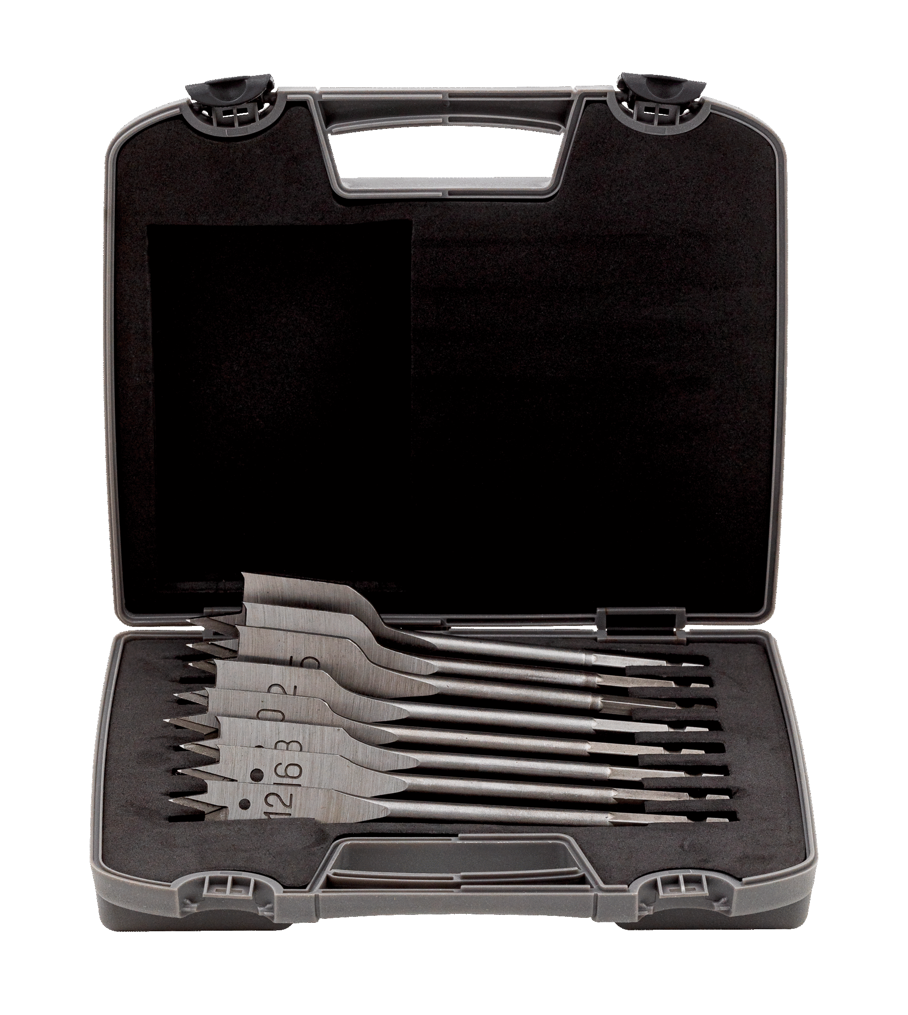 Speedborenset, 8-delig. Inhoud: 12, 16, 18, 20, 22, 25, 28, 32mm. Snel verwisselbare zeskant schacht van 6,35 mm. Platte houtboor (speedboor) voor het boren in hout. Koolstofrijk staal, volledig warmte behandeld.