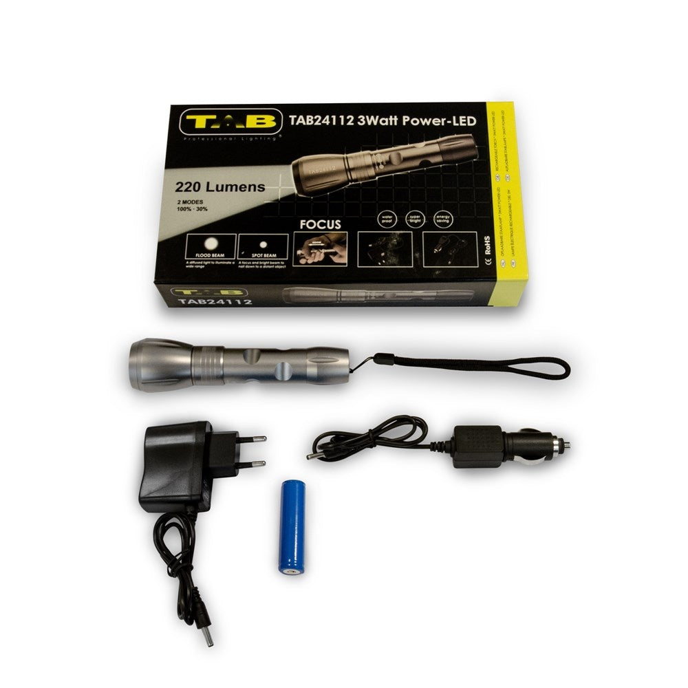 Oplaadbare LED zaklamp 220 Lm. Aluminium met gun-grey finish, instelbare lichtbundel focus/zoom, 2 lichtstanden (100%-30%). Inclusief Lader 230V, 12-24V, 1x batterij Li-ion Accu en Polskoord