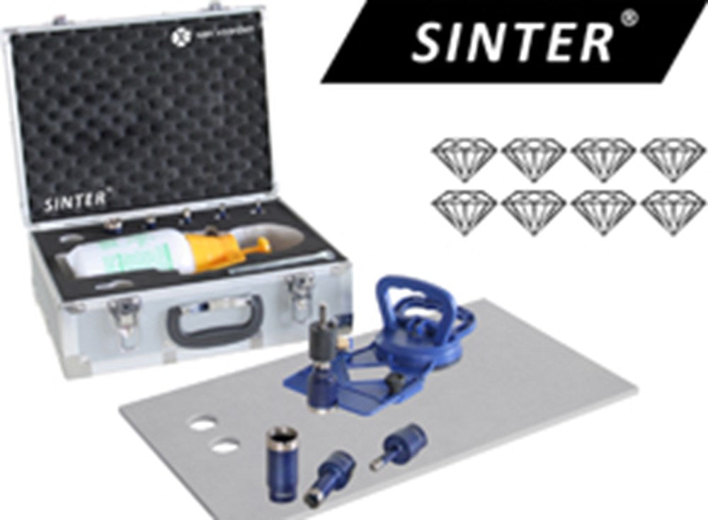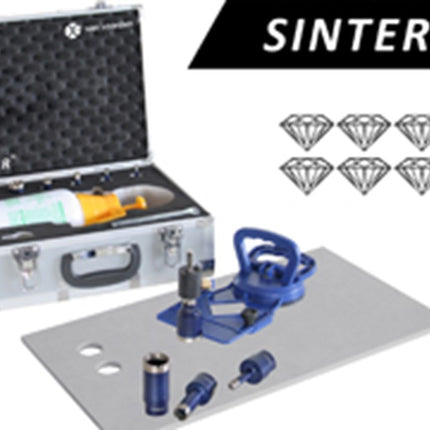 Sinter tegelboorset voor keramische tegels en natuursteen. Aansluiting M12. Bestaande uit 6 boren, diameters 6, 8, 10, 15, 26 en 36 mm met waterspoelkop, watertank en verstelbare centreerhulp in aluminium koffer. Lees meer