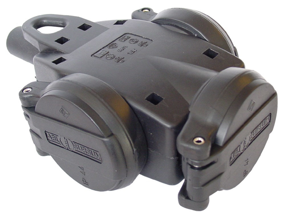 Volrubber hangcontactblok met 3 Schuko contactdozen met veerdeksel en een ophangoog