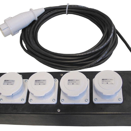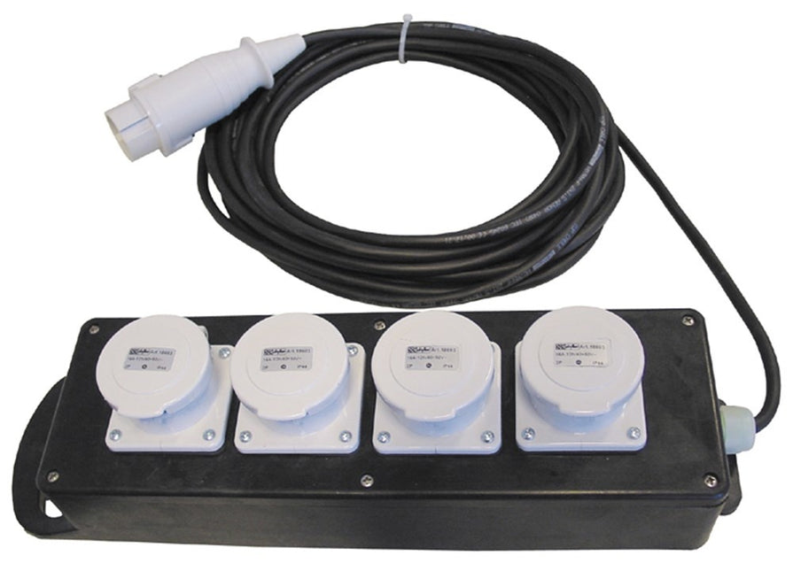 Volrubber verdeelblok met 4 CEE contactdozen met veerdeksel en handgreep.
