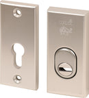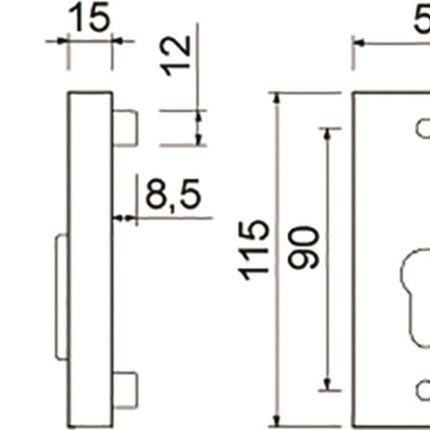 Rechthoekig model, aluminium geanodiseerd. Buitenrozet voorzien van rvs kerntrekbeveiliging. Dikte buitenrozet 15 mm en dikte binnenrozet 8 mm. Afmetingen rozet 115x50 mm. Met blinde bevestiging van binnenuit d.m.v. twee metaalschroeven M6x53 mm. Lees meer