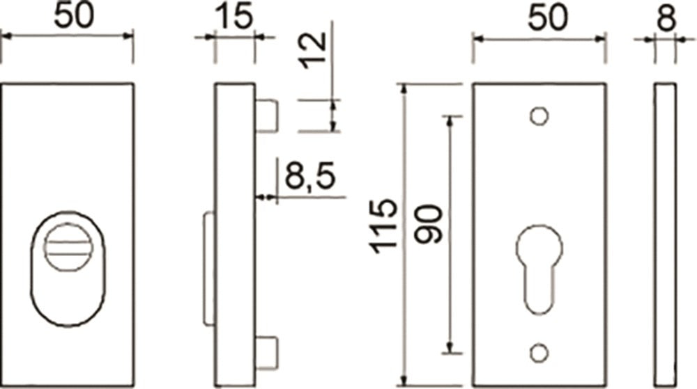 Rechthoekig model, aluminium geanodiseerd. Buitenrozet voorzien van rvs kerntrekbeveiliging. Dikte buitenrozet 15 mm en dikte binnenrozet 8 mm. Afmetingen rozet 115x50 mm. Met blinde bevestiging van binnenuit d.m.v. twee metaalschroeven M6x53 mm.